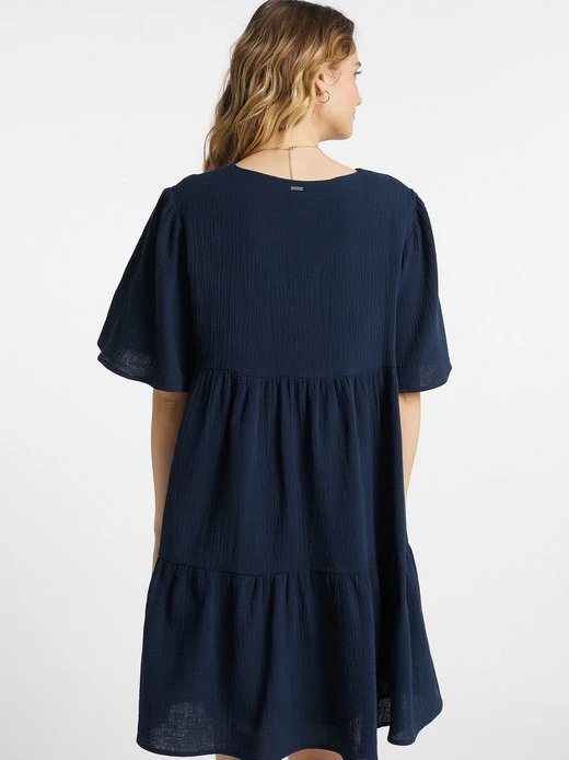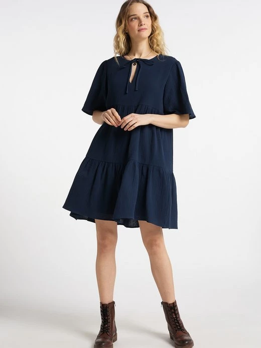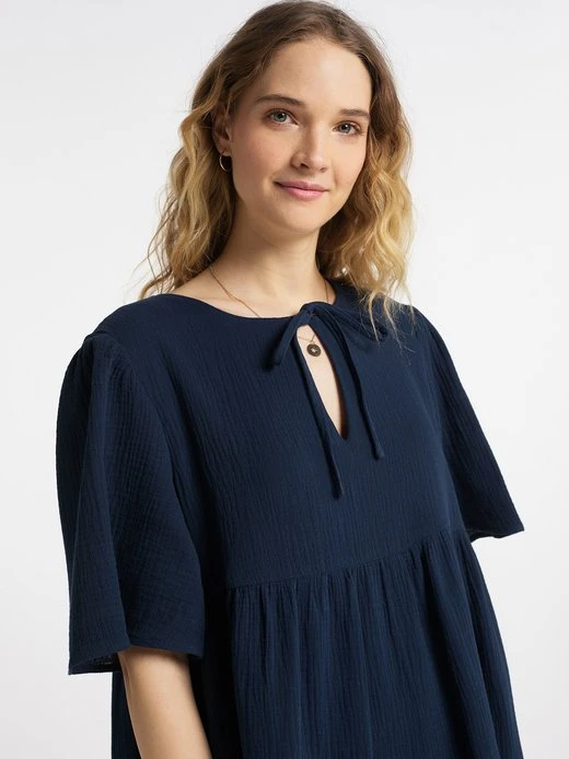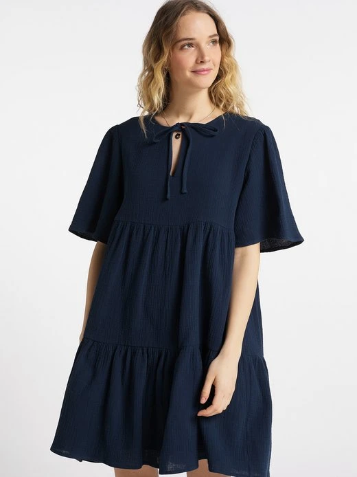 Aus reiner Baumwolle gefertigt, liegt das Musselinkleid von DreiMaster Vintage voll im Trend! Die weite Silhouette wird von den gestuften Volants begleitet und mit einem charmanten V-Ausschnitt mit Bindebändern sowie einem weit geschnittenen Kurzarm komplettiert. Ein Innenfutter aus Baumwolle sorgt für Blickdichte und für ein angenehmes Tragegefühl.