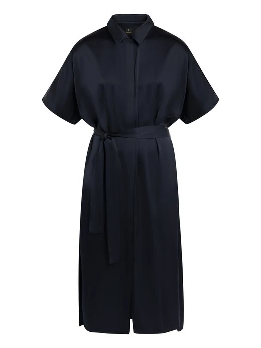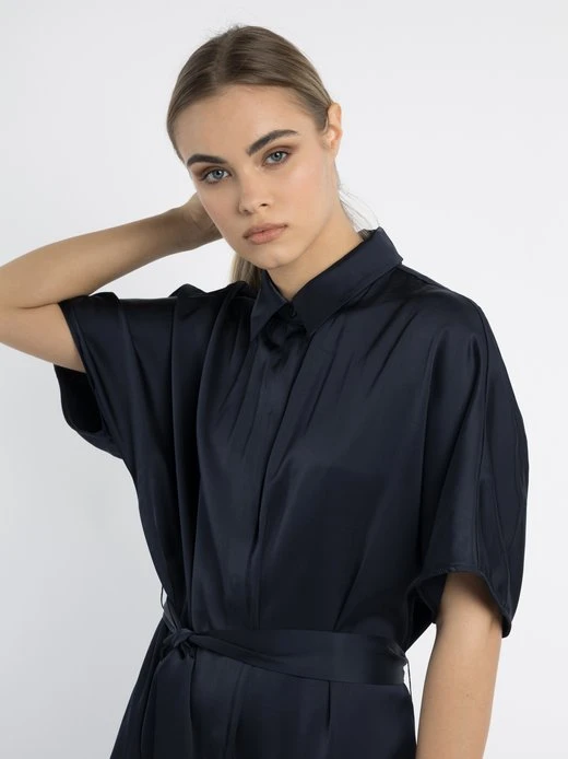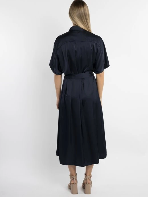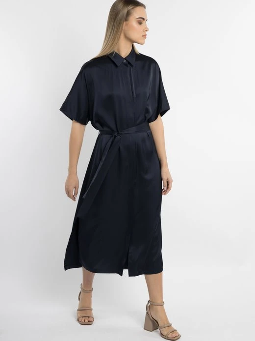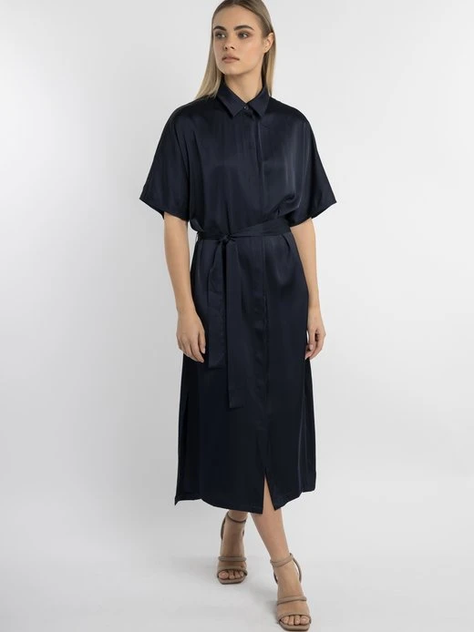 Das Satinkleid von DreiMaster Klassik begeistert mit seiner glänzenden Optik. Obenherum locker geschnitten, fallen die kurzen Ärmel ohne Schulternaht fließend und bilden dadurch einen schönen Kontrast zum klassischen Hemdkragen. Dank des materialgleichen Bindegürtels schmiegt sich die taillierte Passform der femininen Silhouette an. Eine verdeckte Knopfleiste und hohe Seitenschlitze komplettieren das elegante Modell.