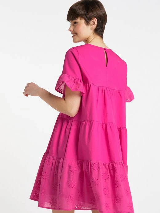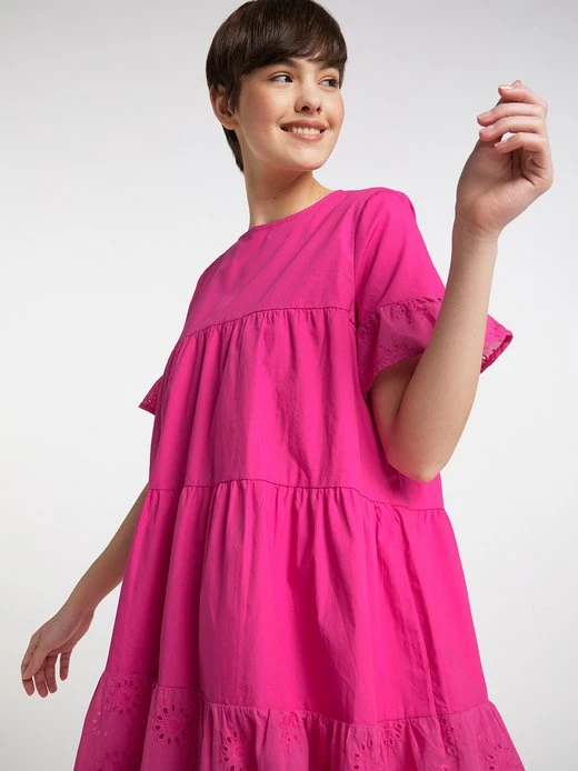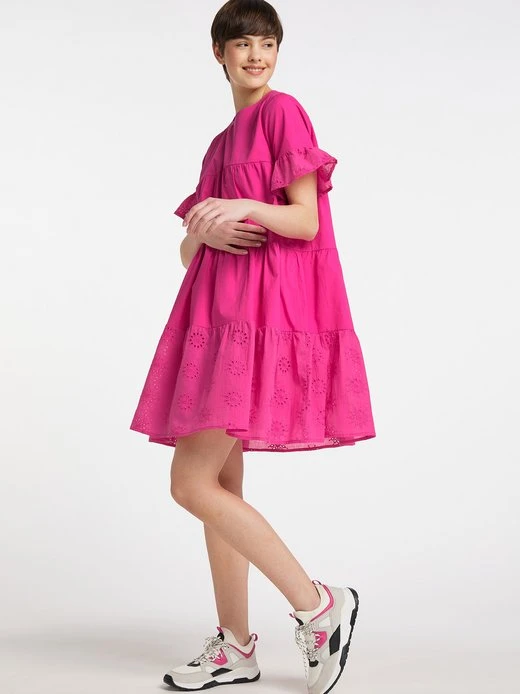 Besonders romantisch und verspielt präsentiert sich das Sommerkleid von myMo. Die lockere A-Linie und die Volants, zusammen mit der Lochstickerei am Saum und an den Ärmeln, ergeben zusammen einen stimmigen Look. Gefertigt aus einem kühlen Baumwollstoff kommen die gerüschten Ärmel und die Lace-Abschnitte besonders charmant zur Geltung. Ein Innenfutter sorgt für ein angenehmes Tragen und für Blickdichte. Perfekt für warme Sommertage oder romantische Sunsets.