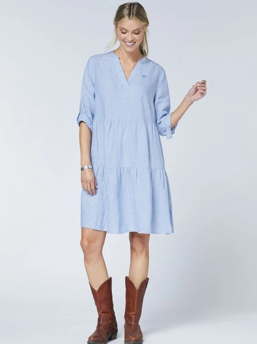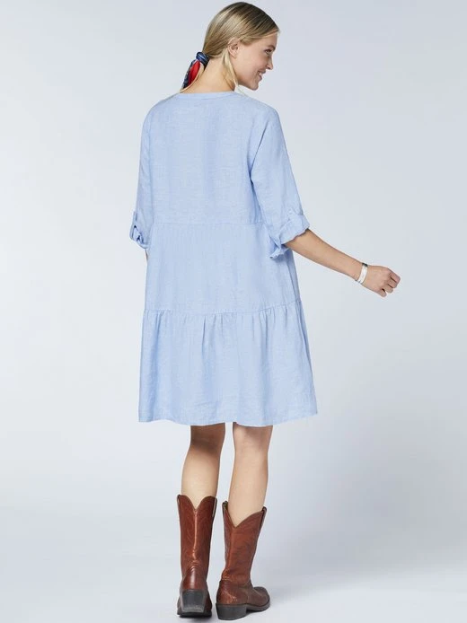 In ausgestellter Silhouette mit Tunika-Ausschnitt schmeichelt das zertifizierte Sommerkleid von POLO SYLT den weiblichen Konturen. Die Rüschenoptik sowie die Grüner Knopf und Made in Green Zertifizierungen machen es gemeinsam zum New-Season-Liebling. Für Komfort sorgen der Schnitt und die Leinenqualität. Das Logo-Symbol auf Brusthöhe verleiht der Damen-Bluse ein typisches POLO-SYLT-Finish.
