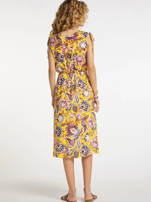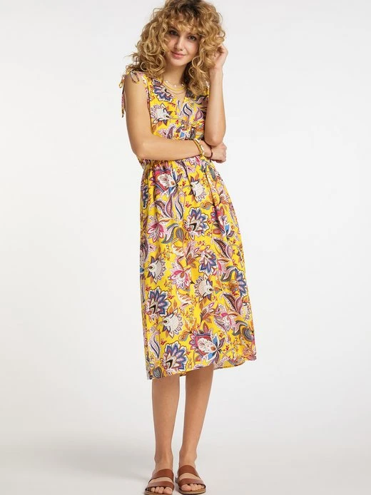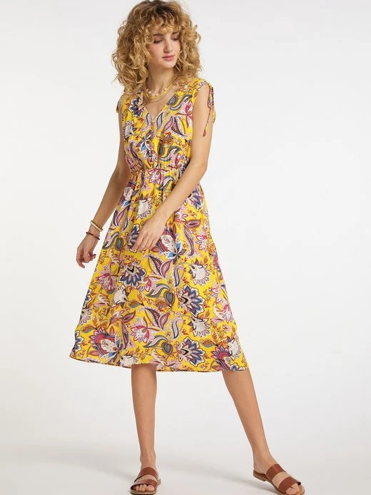 Frische Farben und große Blüten zieren das zeitlose Sommerkleid von usha FESTIVAL. Der ärmellose Schnitt zeigt dabei viel Schwung und die elastische Taille eine feminine Silhouette. Für extra Komfort sorgt ein leichtes Unterkleid. Der tiefe V-Ausschnitt ist mit fünf kleinen, stoffbezogenen Knöpfen verziert. Kleine Akzente machen aus dem Freizeitkleid einen ganz besonderen Style, der zum Picknick, zur Gartenparty oder einfach für einen entspannten Sommertag zu einem idealen Must-have avanciert.